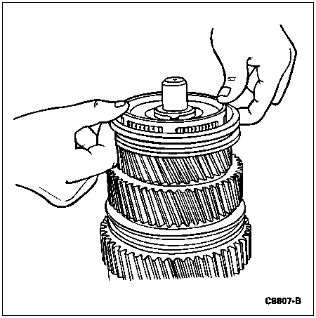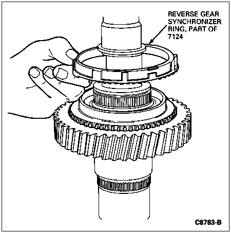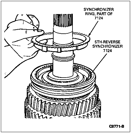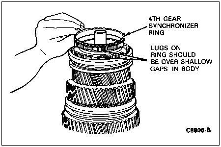 NOTE: The short lugs on the synchronizer ring should be located over the shallow gaps in the 5th-reverse synchronizer body.