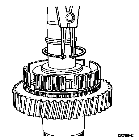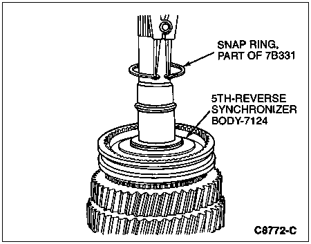 Install the snap ring (part of small parts repair kit) on the mainshaft next to the 5th-reverse synchronizer body. The clearance between the snap ring (part of small parts repair kit) and the synchronizer body should not be more than 0.1mm (0.004 inch) with zero clearance preferable.