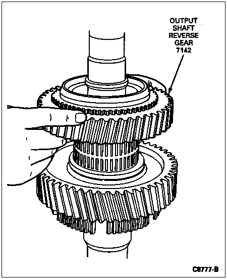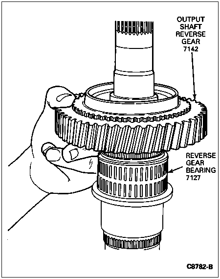 Place the reverse gear on the mainshaft over the reverse gear bearing. The clutching teeth on the reverse gear must face upwards.