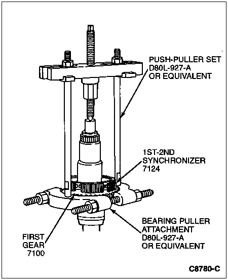 Position Shaft Protector D80L-625-4 or equivalent on the end of the mainshaft. Position the Push-Puller Set D80L-927-A or equivalent on the Collet Retaining Ring and pull the 1st-2nd sliding sleeve (part of synchronizer), 2nd gear, thrust washer (7119), and input bearing spacer from the mainshaft.