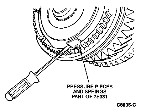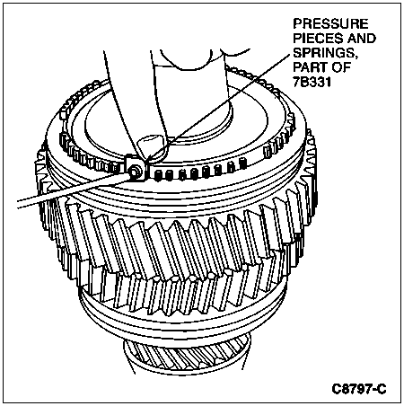 CAUTION: Place a cloth around the synchronizer to catch the compression springs and pressure pieces that will be released when the sliding sleeves are removed.