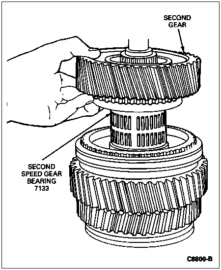 Place the 2nd gear over the second speed gear bearing on the mainshaft. The taper of the 2nd gear must face down on the mainshaft.