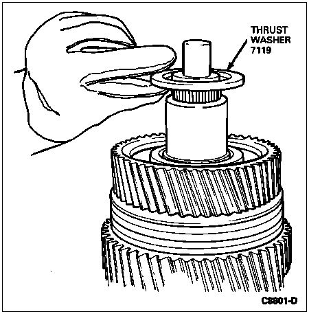 Position the thrust washer on the mainshaft and tap it down until it seats against its stop on the mainshaft. If necessary, gently tap the thrust washer to fully seat it.