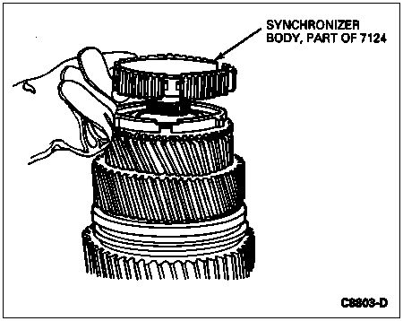 Position the synchronizer body on the mainshaft so that the side with the deeper hub faces down and the short lugs on the synchronizing ring (part of synchronizer) engage in the shallow gaps in the synchronizer body. Push or lightly tap the synchronizer body down until it stops.