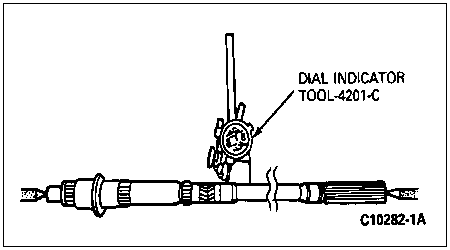 Check output shaft for runout by mounting the shaft between V-blocks and applying Dial Indicator with Bracketry TOOL-4201-C to several places along shaft. The standard reading of the indicator for runout should be less than 0.05mm (0.002 inch). If runout exceeds 0.05mm (0.002 inch), replace shaft.