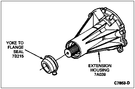 Position the yoke to flange seal in the retainer so the notch on the yoke to flange seal faces upward and the drain hole in the rubber dust boot faces downward. Drive the yoke to flange seal in the retainer using Extension Housing Seal Replacer T61L-7657-B.