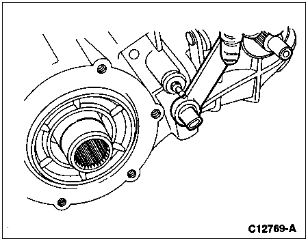 Install the rear output shaft case yoke and slinger onto the rear splines of the output shaft. Install the oil seal, output shaft yoke washer and 32mm shaft nut on the output shaft and tighten to 203-244 Nm (150-180 lb-ft).