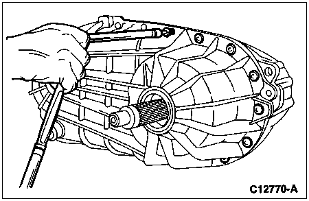 Install the front output shaft through the lower bearing. The front output shaft is held in place in the case by the front output yoke to flange seal and oil seal slinger. Install the front case yoke onto the front output shaft, then the oil seal, output shaft yoke washer and 32mm shaft nut. Tighten the yoke lock nut to 203-244 Nm (150-180 lb-ft).