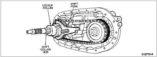 Install the shift collar. Install the high-low shift fork by engaging it with the shift hub flange and rotating it until the roller is engaged with the lower groove of the cam.