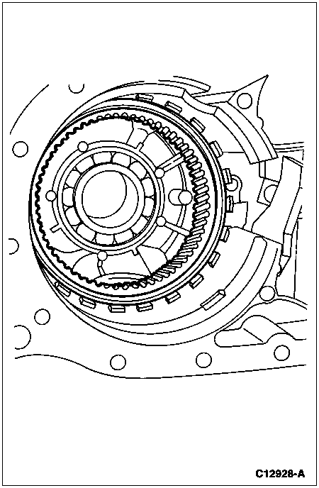 Install the ring gear into the slots in the case and retain it with the large internal snap rings making sure that it is fully seated.