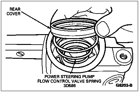 Remove cover and power steering pump flow control valve spring. Remove internal O-ring and backup ring from rear cover. O-ring is inboard of backup ring.