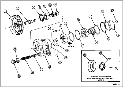 NOTE: Clean all dirt and oil from the external surface of the power steering pump (3A674) after removal. Handle all pump parts carefully to avoid nicks, burrs, scratches and dirt.
