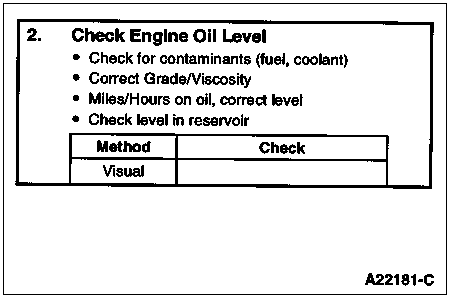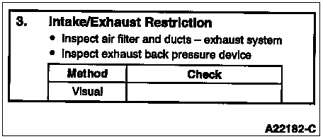 This is a visual inspection to determine if an air intake or exhaust restriction is contributing to a no start or hard start condition. If the engine does start with a high air intake or exhaust restriction, a considerable amount of black/blue smoke is produced.