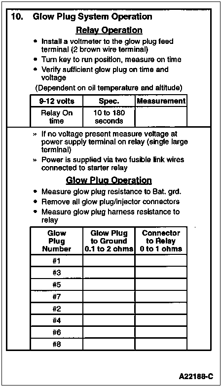 Insufficient glow plug ON time will not allow enough heat to accumulate in the combustion chamber to easily facilitate starting. If the glow plug system ON time does not meet any of the specifications in the accompanying chart the problem is most likely a faulty wire harness connection, ground connections or glow plug relay.