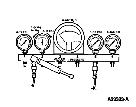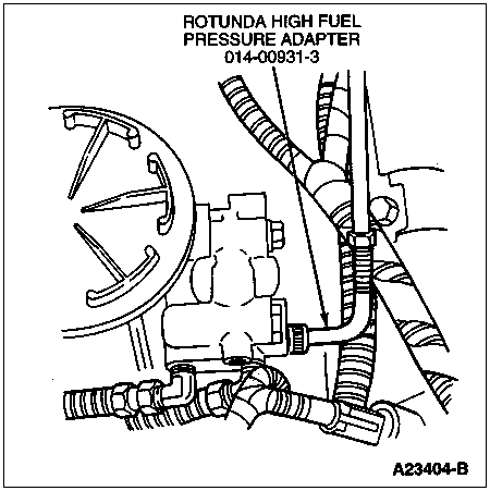 Connect Rotunda High Fuel Pressure Adapter 014-00931-3 or equivalent to the Schrader valve mounted in the fuel regulator block. Connect a line for a 160 psi gauge to the adapter. Crank engine at 100 rpm minimum and measure maximum fuel pressure.