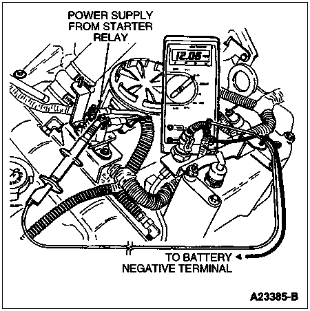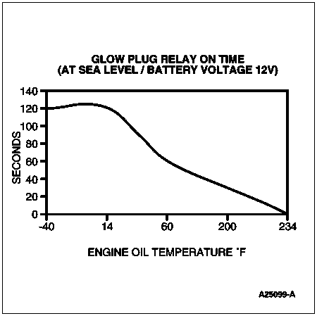 Install a DVOM on the glow plug feed side of the glow plug relay (large stud with two wires connected). Turn the ignition key to the ON position but do not attempt to start. Note the time in seconds from when the key is turned on and the glow plug relay energizes until the glow plug relay de-energizes. The glow plug relay makes a loud click noise which is easily heard when it energizes and de-energizes. The dome light will dim and the dash voltmeter will dip when the glow plugs are drawing current from the battery. Compare the times measured to the table (time will be affected by engine temperature, battery condition and vehicle altitude). The voltage at the glow plug feed terminal may vary from 9 to 12 volts depending upon battery condition.