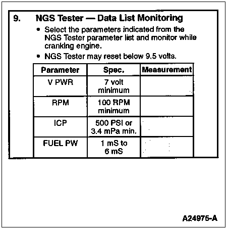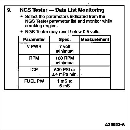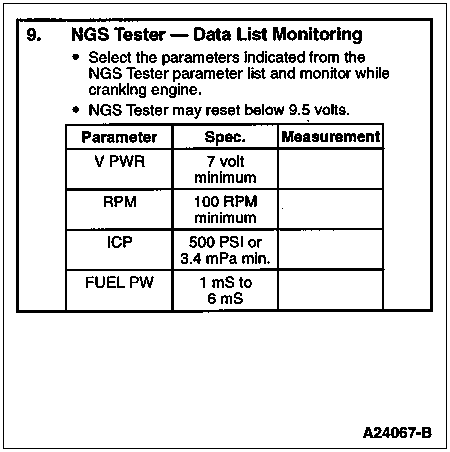 Install NGS Tester. Access FUEL PW PID on NGS Tester and monitor while cranking engine.