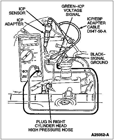 Remove the cap and plug, then reinstall the high pressure hose to the right cylinder head. Remove the high pressure hose from the left cylinder head and cover the fitting on the cylinder head with the appropriate cap from the Fuel/Oil/Turbo Protector Cap Set T94T-9395-AH. Install the ICP adapter from the Oil High Pressure Leakage Test Adapter Set D94T-6600-A into the high pressure hose. Remove the ICP sensor and install the sensor in the end of the ICP adapter. Connect the ICP/EBP Adapter Cable D94T-50-A to the ICP sensor. Connect a DVOM between the signal return and ICP signal wires of the ICP/EBP Adapter Cable D94T-50-A. Crank the engine and monitor the signal. The DVOM should read 1 to 4 volts.