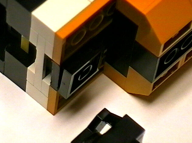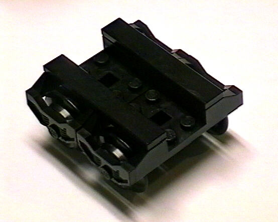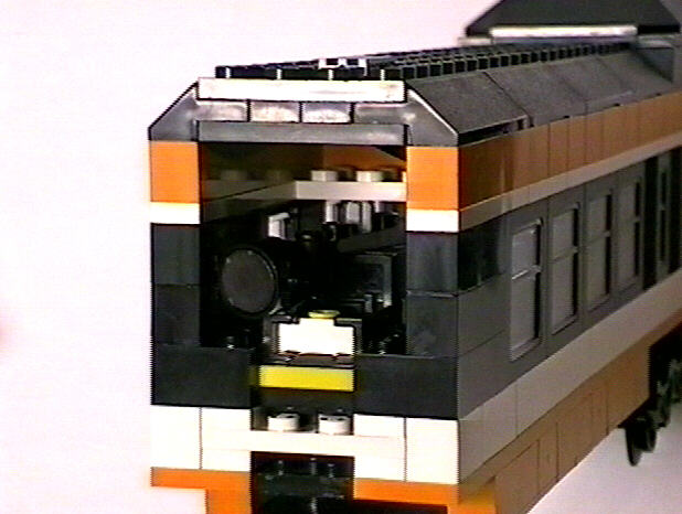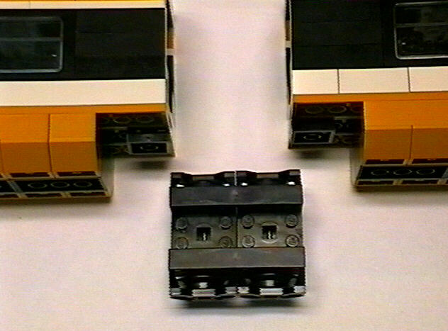 This is the coupling used on all the coaches. The most important element is the spring-loaded piece from set #4559. Notice also that the coupling is mounted back half a stud. The magnet is allowed to swing on an arm for negotiating curves.