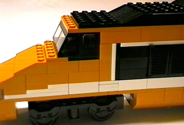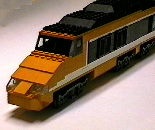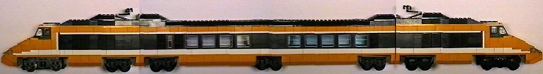 Here are some photos of my TGV I have been building, inspired by James Mathis' version and my recent acquisition of a large quantity of orange bricks. Apologies for the poor quality but they were taken from my camcorder (I really need a digital camera), and the first one is from 4 frames stitched together, a long shot that fits the whole thing in one frame is way too fuzzy.