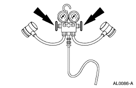 Turn both valves on the R-134a Manifold Gauge Set all the way to the left to close the low-pressure and high-pressure hoses to the center manifold and center hose.