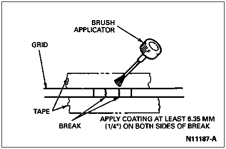 NOTE: If the brown layer of the grid is not broken or missing, apply only the grid repair compound to the break. If both brown and silver layers of grid are broken or missing, apply a coating of the brown touch-up paint across break area first. Two coats may be necessary to obtain proper color. Allow touch-up paint to dry, then apply three coats of grid repair compound, allowing three to five minutes drying time between coats. The coating of grid repair compound should extend at least 6.35mm (1/4 inch) on both sides of break area.