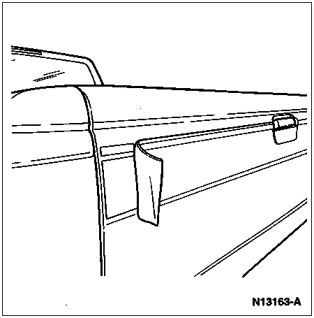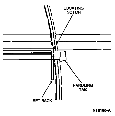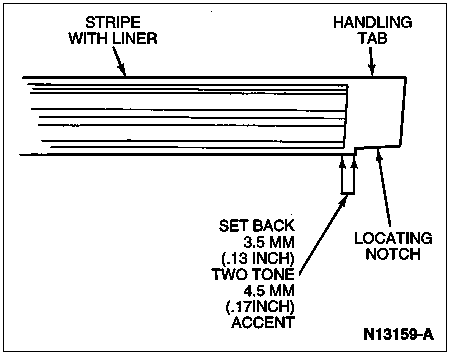 Position carrier edge or locating notch on tape stripe to body openings and/or character lines on the vehicle. The tape stripe has a setback of 3.5mm (0.13 inch) (two-tone) or 4.5mm (0.17 inch) (accent) on both ends from panel edge. The tape stripe also has a 20-30mm (0.78-1.10 inch) extension on the leading edge of the tape stripe liner to act as handling tabs. The locating notch should be positioned to the panel edge. This will aid in the positioning of the designed setback from the panel edge. Tape stripe DOES NOT wrap around panel edges.