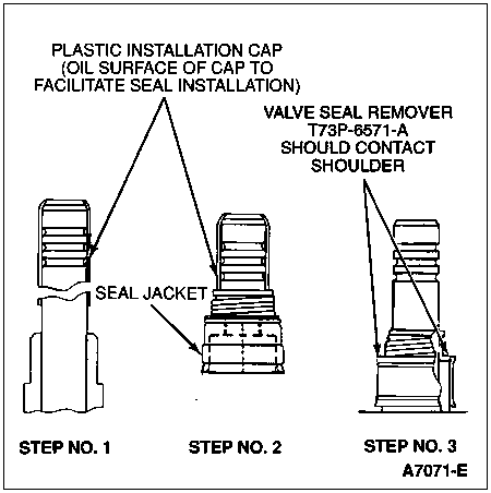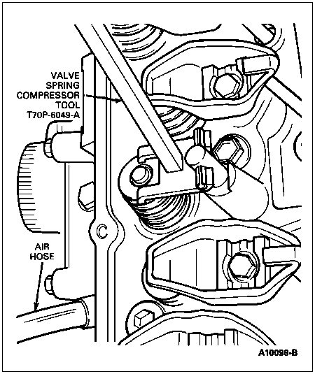Using Valve Spring Compressor T70P-6049-A, compress the valve spring and remove the valve spring retainer keys, valve spring retainer, and valve spring. Remove and discard the valve stem seal.