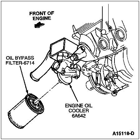 Place a drip pan under the oil bypass filter (6714). Unscrew the oil bypass filter from the engine oil cooler (6B856) using an oil filter wrench. Clean the oil filter mounting insert (6890) or engine oil cooler recess. Clean the oil bypass filter gasket surface. Make sure oil bypass filter gasket is not stuck on oil filter mounting insert or engine oil cooler.