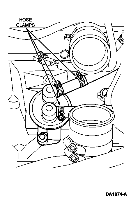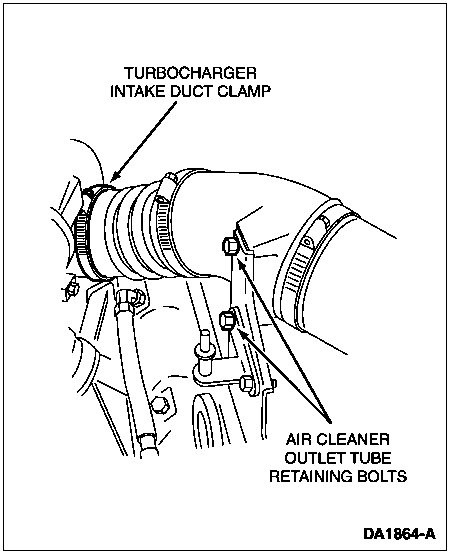 Remove the two (2) bolts retaining the air cleaner outlet tube to the support bracket on the left valve cover. Remove and discard the crankcase ventilation hose clamp and disconnect the hose. Loosen the clamp at the turbocharger. Remove the tube from the turbocharger and position out of the way.