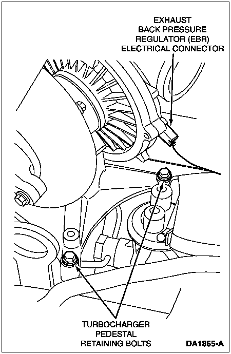 Install protective caps. Remove the four (4) bolts retaining the turbocharger pedestal assembly to the cylinder block. Disconnect the electrical connector from the turbocharger and remove the turbocharger pedestal assembly.