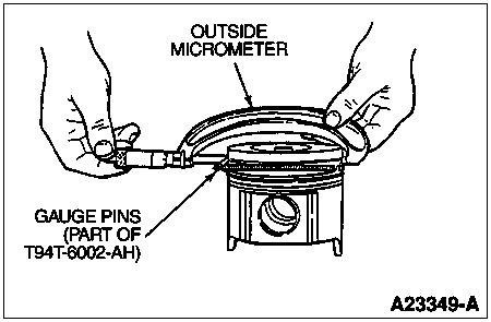 Check keystone piston ring groove wear using Keystone Piston Ring Gauge Set T94T-6002-AH. Install the gauge pins in the appropriate groove and measure diameter with an outside micrometer. The acceptable range for the top compression ring groove is 4.097-4.130 inches. If specification is not in the acceptable range, replace the piston.