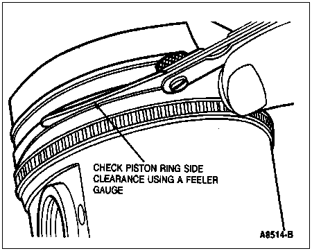 Check intermediate and oil control ring side clearance using a feeler gauge in between the ring and the ring land. Refer to Specifications for proper clearances.