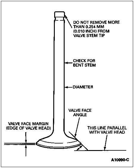 Inspect valve face and edge of valve head for pits, grooves or scores. Inspect stem for a bent condition and end of stem for grooves or scores. Check valve head for signs of burning or erosion, warpage and cracking. Minor pits, grooves, etc., may be removed. Discard severely damaged valves.