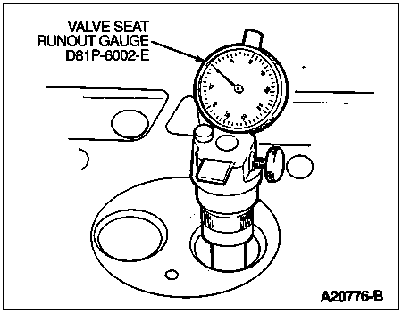 Check valve seat runout with suitable valve seat Runout Gauge D81P-6002-E or equivalent. Follow instructions of gauge manufacturer. If runout exceeds service limit, reface valve and valve seat. Refer to Specifications at the end of this section.