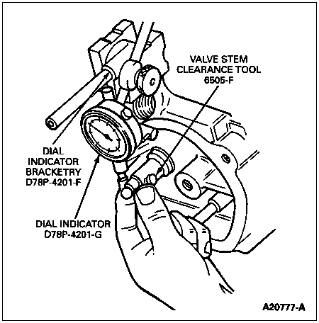 Check valve stem to valve guide clearance of each valve in its respective valve guide with Valve Stem Clearance Tool TOOL-6505-F, Dial Indicator D78P-4201-G and Dial Indicator Bracketry D78P-4201-F or equivalents. Use a flat-end indicator point.
