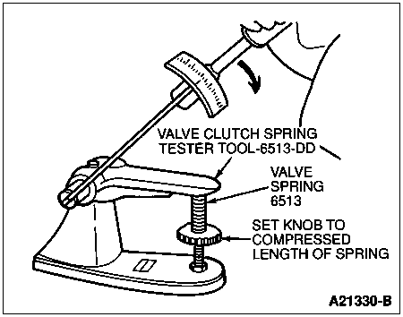 Check the valve springs for proper pressure at the specified spring lengths using Valve/Clutch Spring Tester TOOL-6513-DD or equivalent. Apply torque until click is heard; read torque wrench and multiply reading by two. Weak valve springs cause poor engine performance. Replace any valve spring not within specification. Refer to Specifications at the end of this section. Manually rotating the valve springs while installed in the engine will not determine condition of valve springs.
