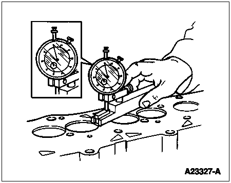 Position dial indicator with its flat tip against center portion of tool's spherical section at approximately 90 degrees to valve stem axis. Move tool back and forth in line with indicator stem. Take a reading on dial indicator without removing tool from valve guide upper surface. Divide reading by two, the division factor for tool. If valve stem to valve guide clearance exceeds specifications listed at the end of this section, replace cylinder head (6049).