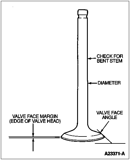 If valve face runout is excessive and/or to remove pits and grooves, reface valves to specification. Remove only enough stock to correct runout or to clean up pits and grooves. If intake valve margin is less than 2.84mm (0.112 inch) thick after grinding, replace valve or valve will run too hot in engine. If exhaust valve margin is less than 1.35mm (0.053 inch) thick after grinding, replace valve.