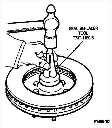 Place the bearing cone and roller in the bearing cup and install the new wheel hub grease seal with an appropriate tool such as Seal Replacer T73T-1190-B. Make sure the wheel hub grease seal is fully bottomed.