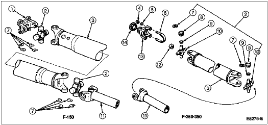 All universal joints are of the lubed-for-life needle-bearing type except F-Super Duty Stripped Chassis which have lubrication fittings. Replacement universal joints equipped with grease fittings should be lubricated at the intervals specified in Section 00-03. The universal joint bearings are retained on the spiders by snap rings and U-bolts on some applications.