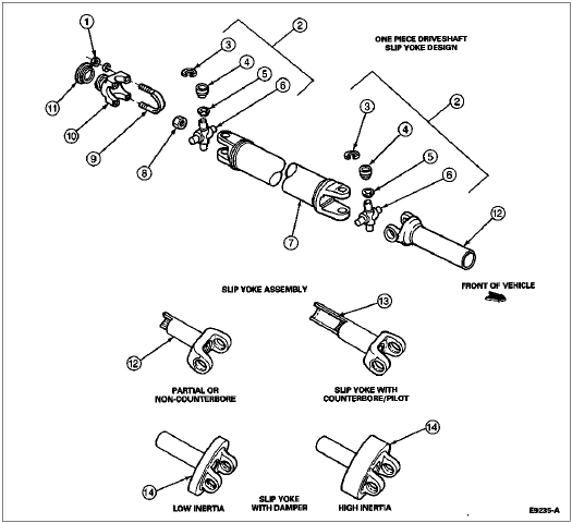 Some vehicles use a one-piece slip yoke driveshaft. A universal joint and driveshaft slip yoke are located at the transmission end of the shaft, where they are held in alignment by a bushing in the extension housing (7A039). The driveshaft slip yoke and transmission output shaft permit fore and aft movement of the driveshaft as the rear axle moves up and down. This provides smooth performance during vehicle operation. An extension housing seal at the extension housing prevents leakage and protects the driveshaft slip yoke from dust, dirt and other harmful material. A second universal joint mates with the rear axle companion flange at the rear axle.