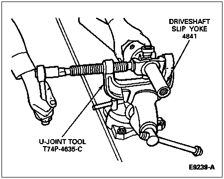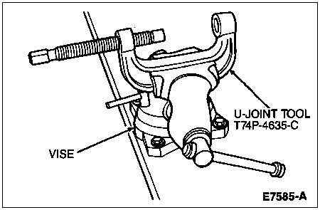 Position the driveshaft slip yoke (4841) in the U-Joint Tool and press out bearing. If bearing cup cannot be pressed all the way out of the driveshaft slip yoke, remove it with vise grip or channel lock pliers.