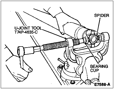 Position the new spider in the driveshaft yoke and press the bearing cup 6.3mm (1/4 inch) below the yoke surface using U-Joint Tool T74P-4635-C.