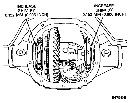 If backlash is 0.025-0.177mm (0.001-0.007 inch), or greater than 0.38mm (0.015 inch), correct backlash by increasing thickness of one differential bearing shim and decreasing thickness of the other differential bearing shim by the same amount. Refer to Backlash and Shim Change Chart.