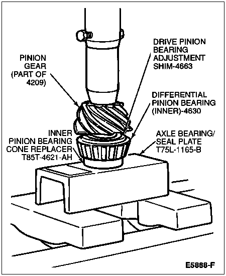 Place the selected shim(s) on the pinion and press the bearing until it is firmly seated on the shaft using Inner Pinion Bearing Cone Replacer T85T-4621-AH and Axle Bearing/Seal Plate T75L-1165-B.