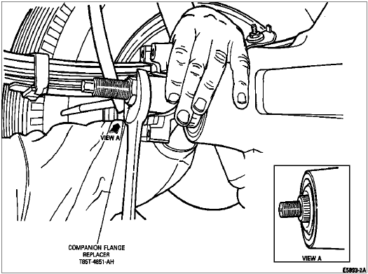 Hold the rear axle universal joint flange with Companion Flange Holding Tool T57T-4851-B while tightening the nut.