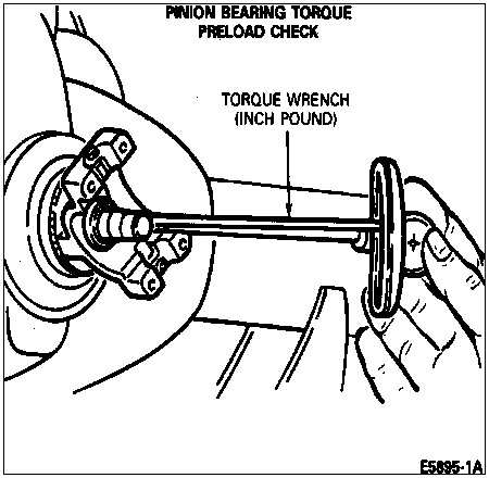 Tighten the pinion nut, rotating the pinion occasionally to make sure cone and roller bearings are seating properly. Take frequent torque-to-rotate (preload) readings until the original recorded preload reading is obtained by rotating the pinion with a Nm (inch-pound) torque wrench.