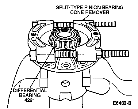 Mount the differential case (4204) in a vise. Use brass pads on vise jaws to prevent damage. Mount split-type pinion bearing cone remover (Bearing Pulling Attachment D79L-4621-A or equivalent) on the differential case. Tighten bolts on puller to separate the bearing cone from the case face.