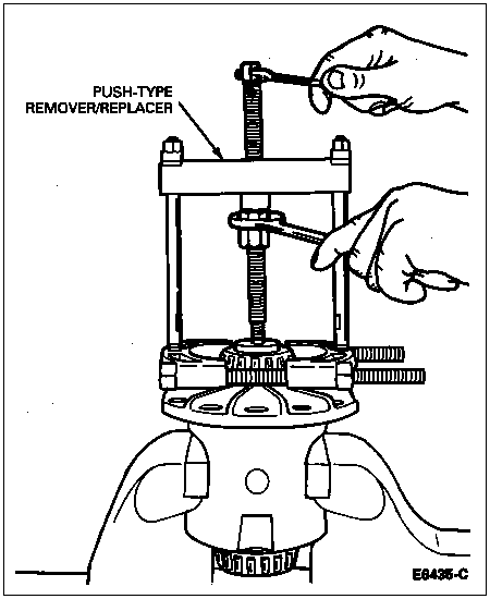 Mount Front Hub Remover/Replacer T81P-1104-C on the bearing cone remover, making sure that the remover/replacer shaft seats in the bore of the step plate. Pull the differential bearing off the differential case.